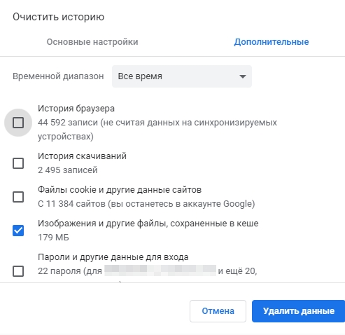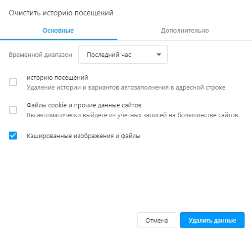 3. Проверьте, что включена только опция «Кэшированные изображения и файлы» и нажмите кнопку «Удалить данные».